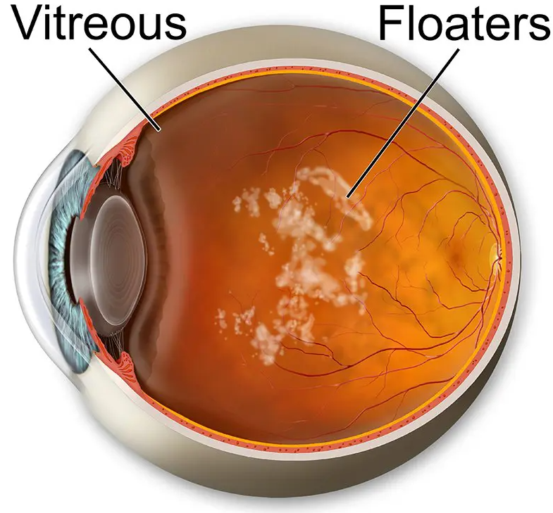 Floaters e flashes são pequenas manchas de vários formatos que se deslocam do campo de visão. Eles podem ser preocupantes, especialmente quando se desenvolvem muito de repente. Durante o processo de descolamento posterior do vítreo, a retina pode sofrer pequenas roturas e se descolar. Esse descolamento que somente pode ser tratado com fotocoagulação da retina com laser ou cirurgia vítreorretiniana.